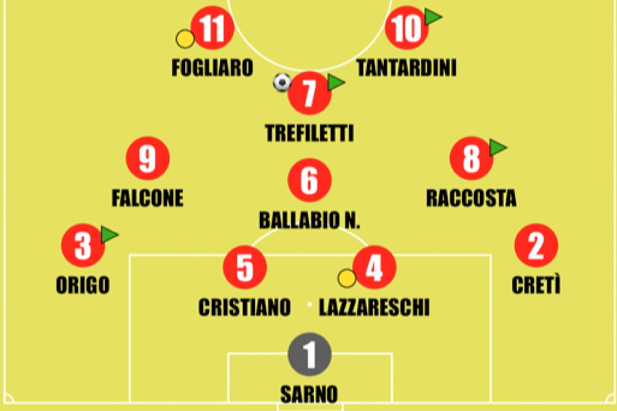 L'undici di Luca Morin: 4-3-1-2 speculare cn Sarno tra i pali, Pantaleo Cretì - fresco di convocazione in Nazionale - sulla destra con Origo a sinistra e Lazzareschi e Cristiano in mezzo; Nicolò Ballabio argine in mediana con Raccosta mezzo destro e Falcone mezzo sinistro; il trequartista è Trefiletti, davanti con Fogliaro c'è Tantardini