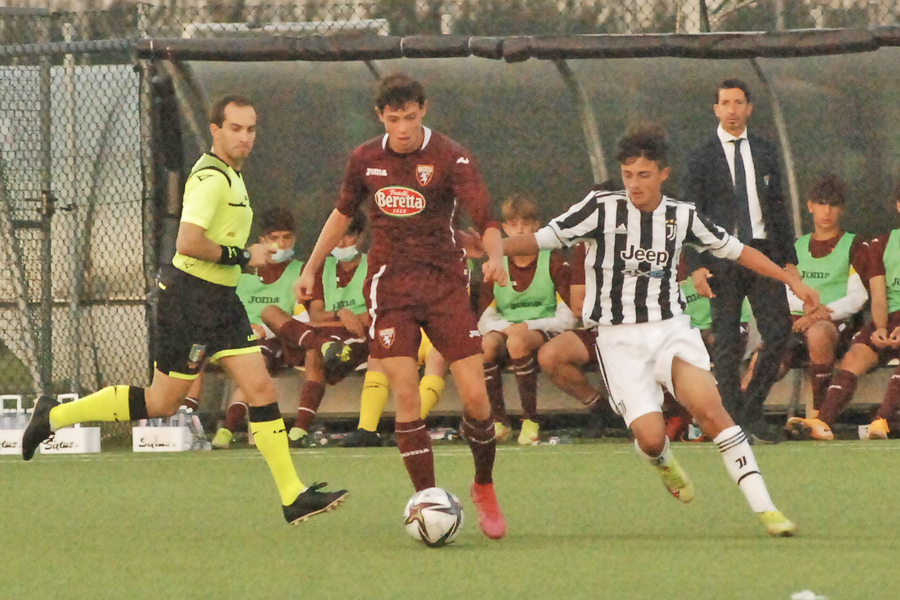 Juventus che prova a fare la partita, pressing asfissiante del Torino Al via la quarta giornata di campionato, Juventus che vuole vincere il derby per rimanere in scia al Monza (capolista a punteggio pieno), Torino che con una vittoria invece potrebbe scavalcare i concittadini in classifica. Le due formazioni entrano in campo con moduli speculari, entrambi con un 4-3-3 proiettato in avanti. Finocchiaro si mette subito in mostra al 4', quando con un dribbling secco sulla linea di fondo fa andare fuori tempo Sardo, serve in mezzo Pugno che calcia forte ma rasoterra, facile per Bellocci. Come detto la Juve fa la partita, o almeno ci prova, dato l'enorme pressing granata sui portatori di palla di Piero Panzanaro. Match che in queste fasi iniziali viene giocato soprattutto a centrocampo, tanti contrasti e qualche fallo, spezzettano il ritmo di gara. Al 9' un'invenzione di Boufandar pesca tra le linee Pugno, che calcia di prima intenzione, tiro alto sopra la traversa. Ospiti che riescono finalmente a farsi vedere dalle parti di Cabella, al 22' una bella azione tutta confezionata sulla fascia destra tra Di Paolo e Muratore, lo scambio tra i due manda il numero 2 al cross, un ottimo traversone per Raballo, che però non ci crede. Fase centrale di primo tempo che ribalta un po' gli equilibri che si sono visti ad inizio partita, ora sono gli ospiti a gestire la palla e a creare occasioni. Sempre dalla destra e sempre con Muratore che innesca Scarfiello, pescato però in fuorigioco. Juventus che fatica leggermente in questa fase di match ed è costretta a ripiegare e difendere con tutti gli uomini. Bianconeri che riescono ad uscire dal pressing avversario grazie alle giocate individuali di Finocchiaro, che al 31' guadagna bene di astuzia una rimessa laterale. Dalla stessa rimessa riceve palla proprio Finocchiaro, il diez salta facile Muratore crossa alla perfezione in mezzo alle spalle di Desole sbuca Piccinin che con la punta del piede tocca la palla e la insacca in rete, 1-0 Juventus, che si porta in vantaggio a pochi minuti dall'intervallo. Dal momento del gol fino al break, la formazione di Franco Semioli scompare dai radar offensivi e deve soffrire le avanzate dei giocatori bianconeri, galvanizzati dal gol. Si mette in mostra bene Scienza al 35', combina bene con Pugno e Ventre, il numero 8 va al tiro, ma la conclusione viene deviata in angolo, rimane la bella giocata sulla destra dei tre ragazzi di Panzanaro. L'ultima chanche è per Finocchiaro, viene pescato bene tra le linee da Scienza, il diez calcia di sinistro ad incrociare, palla però a lato di un metro. Primo tempo che si conclude sull'1-0 Juventus.