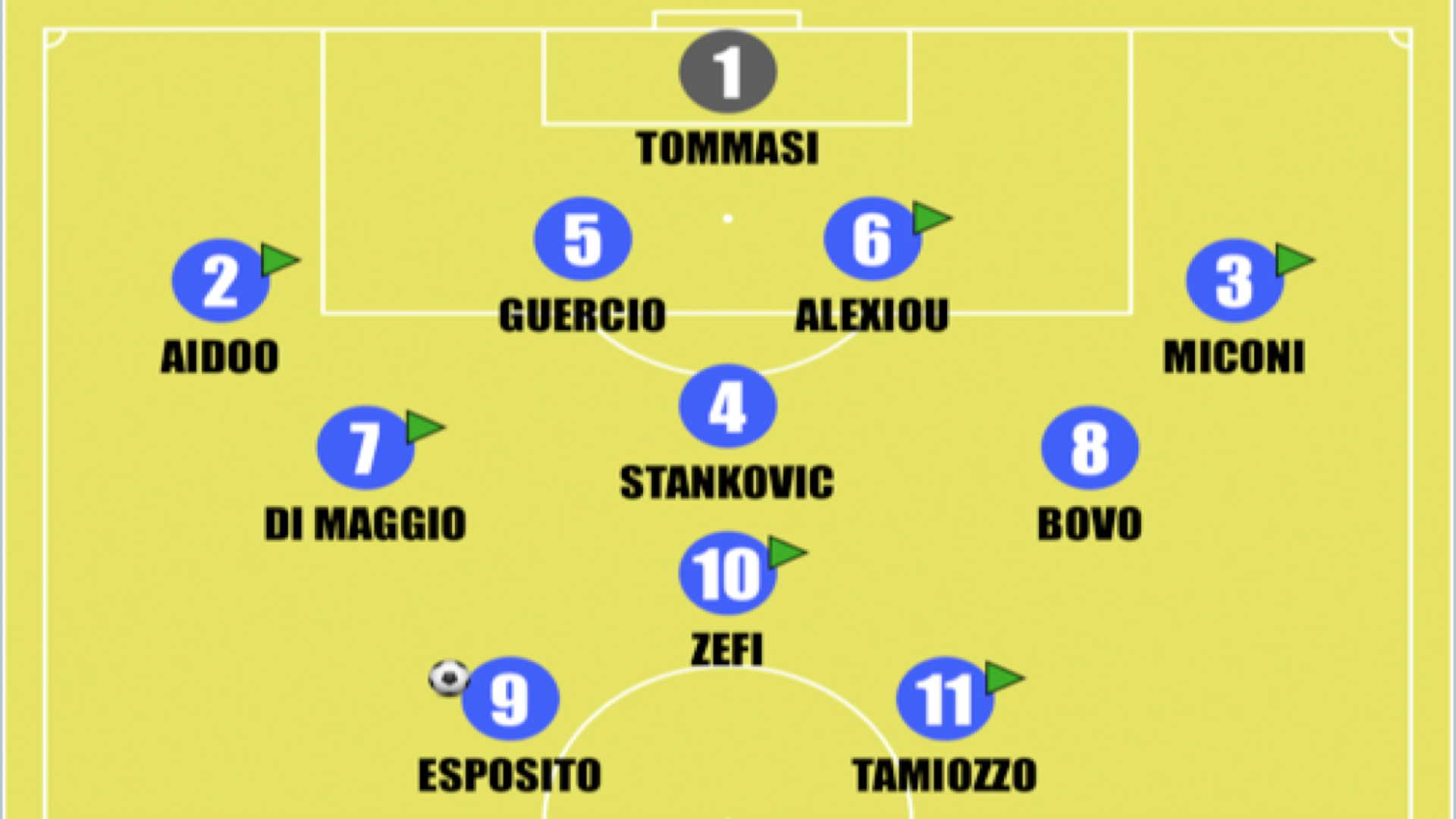 Miconi 6.5 Dimostra ancora una volta che su di lui ci si può contare eccome. Che sia a sinistra (primo tempo) o a destra (secondo tempo) il risultato non cambia: prova di carattere e personalità, nonostante nella ripresa abbia lasciato qualche spiraglio di troppo ai rossoneri. Ma vista la situazione di punteggio ci può anche stare (35’ st Vedovati sv).