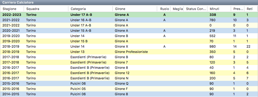 La carriera e le presenze in campionato al Torino di Luca Scarfiello