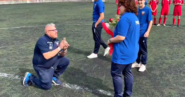 Dichiarazione che è una vera e propria proposta di matrimonio, vecchio stile: lui in ginocchio davanti a lei, nel cerchio di centrocampo, con l'anello e la classica domanda: «Mi vuoi sposare?». Da contorno i ragazzi dell'Accademia Real Torino, "complici" del proprio allenatore, e quelli del Borgata Cit Turin che hanno assistito e applaudito la romantica scena d'amore.