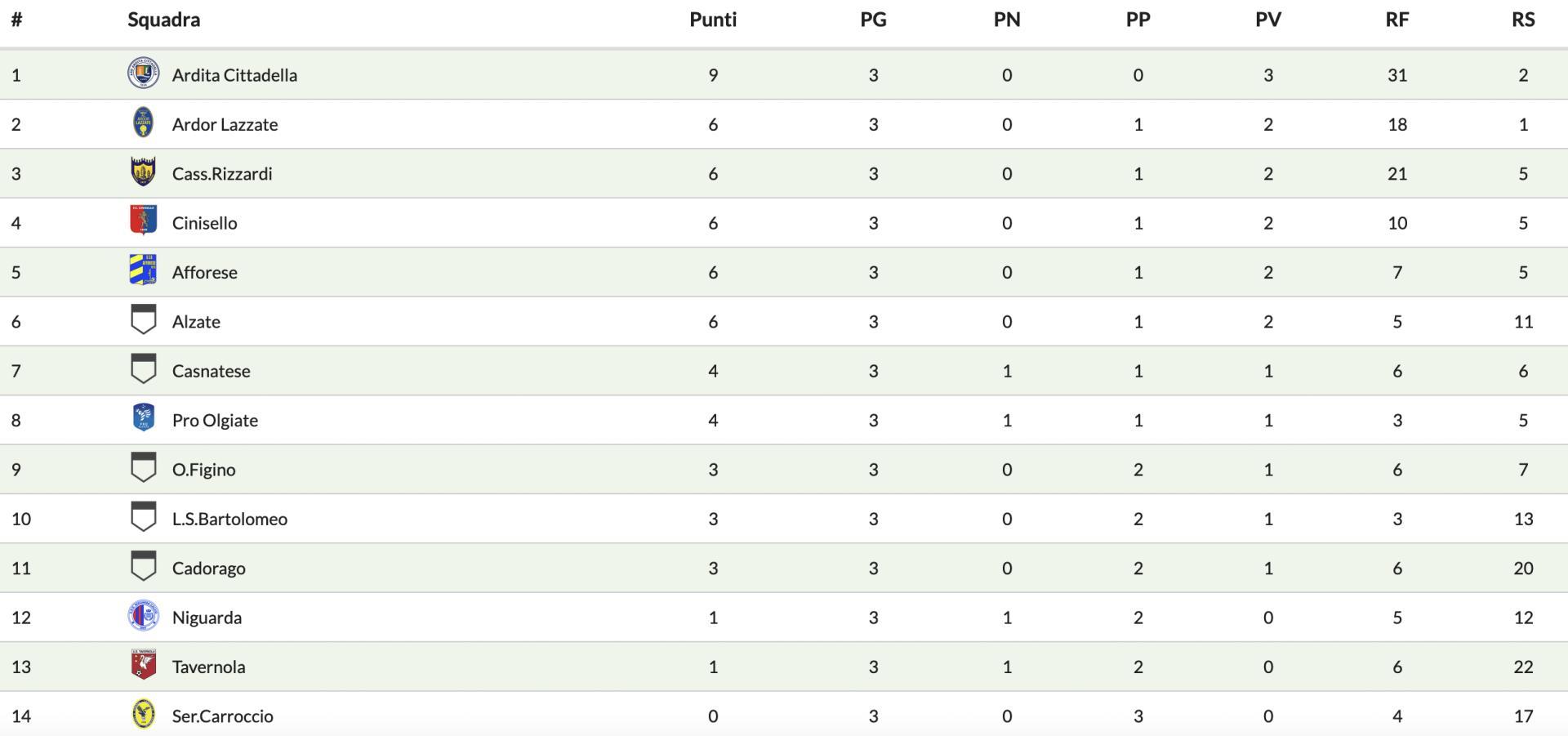 Da qui il 3-0 in favore dei padroni di casa, che, unito alle deliberazioni riguardanti il San Bartolomeo, ridisegna la classifica del girone. Il Libertas rimane a quota 3 punti, ma scende al decimo posto, un gradino sopra il Cadorago, che festeggia la prima vittoria in campionato, mentre la Pro Olgiate cala addirittura dalla seconda posizione all'ottava. Balzo in avanti infine per l'Alzate, che va a quota 6 aggregandosi proprio sul podio al gruppetto formato da Ardor Lazzate, Cassina Rizzardi, Afforese e Cinisello, sceso dalla vetta per la sopracitata sconfitta a tavolino.