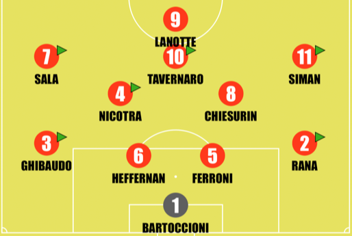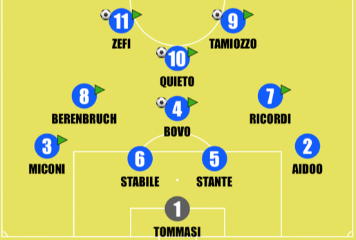 Rispetto al Torino Zanchetta cambia quattro interpreti: in difesa Aidoo prende la fascia destra al posto di Nezirevic e Stante torna al fianco di Stabile al posto di Casani, a centrocampo Ricordi ritrova la titolarità a scapito di Ciuffo, davanti con i confermatissimi Quieto-Tamiozzo torna la fantasia di Zefi al posto della fisicità di Vedovati