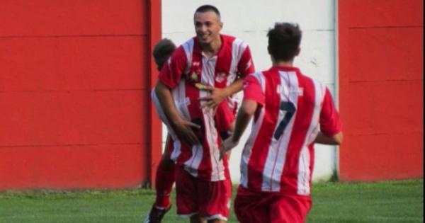 I ragazzi di Pedoja in un momento di festa: in particolare, il numero 7 Mazzoleni, autore della tripletta, insieme ad Anello e Monti