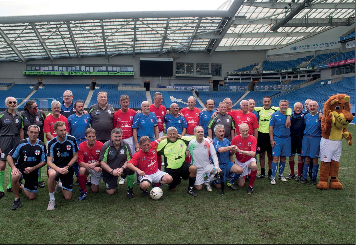 Il 13 maggio dell’anno successivo si è svolto il primo incontro evento internazionale per squadre nazionali della storia del Walking Football. Nella splendida cornice dell’Amex Stadium di Brighton si sono sfidati i team di Inghilterra ed Italia nelle categorie Over 50 ed Over 60, con le nostre rappresentative che a quel tempo, avendo un numero limitato di praticanti, hanno visto la partecipazione di giocatori esclusivamente provenienti dal Piemonte ed i nostri atleti ne sono usciti sconfitti pur con risultati onorevoli, nonostante la differenza di esperienza di gioco.